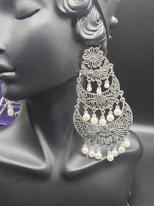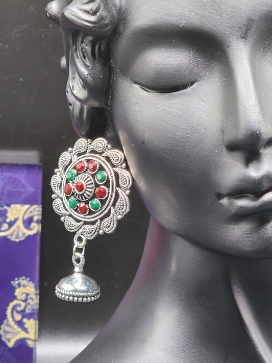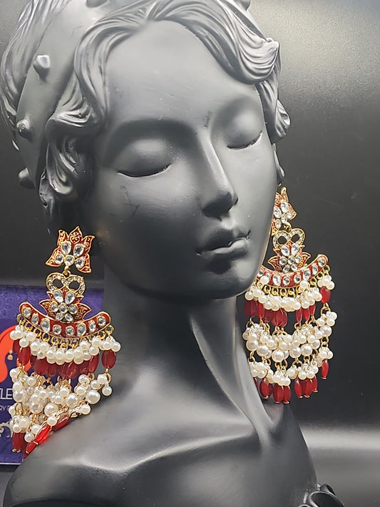 Black & Red Floral Chandbali Earrings with Pearl Drops