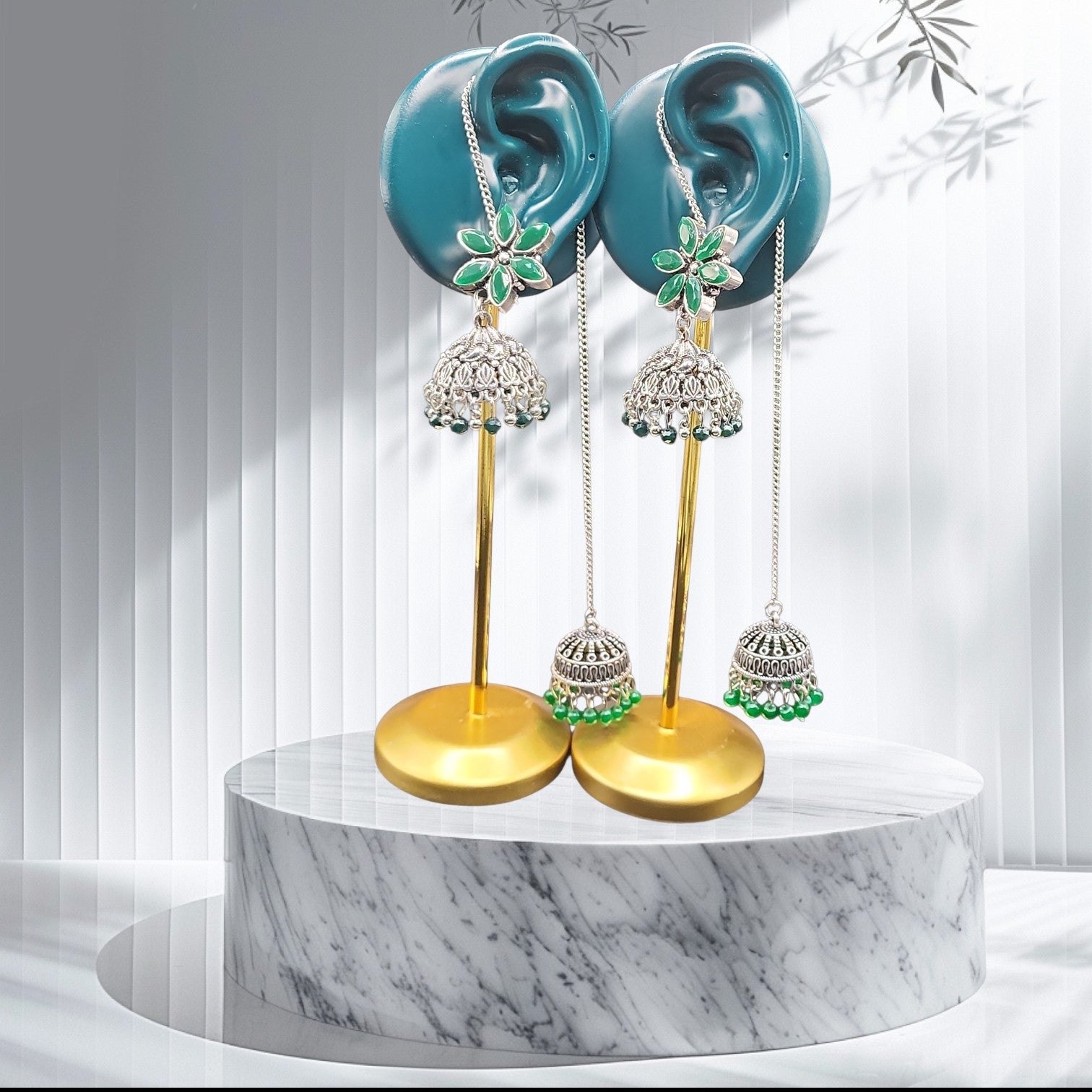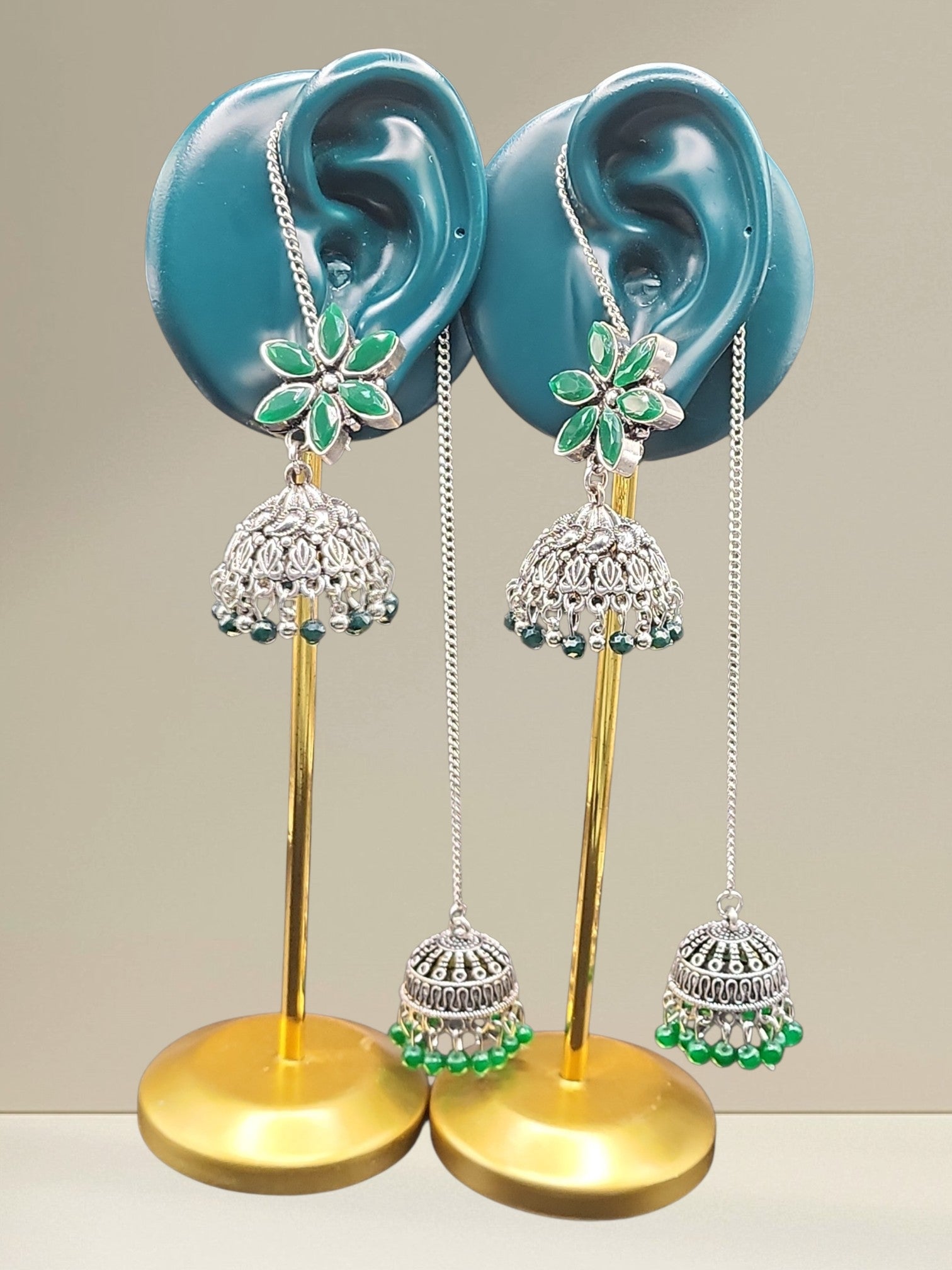 Each earring is handcrafted by artisans using an oxidized silver finishing technique — a process where metal is deliberately aged to create a rich, vintage patina that highlights every intricate detail. The green stone floral stud is set by hand, and the chain connecting the two jhumka drops is carefully assembled to ensure perfect balance and drape.